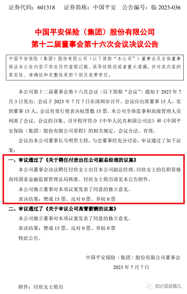 近日,中国平安公告称,公司董事会决议聘任付欣出任公司副总经理,付欣的任职资格尚待国家金融监督管理总局核准。