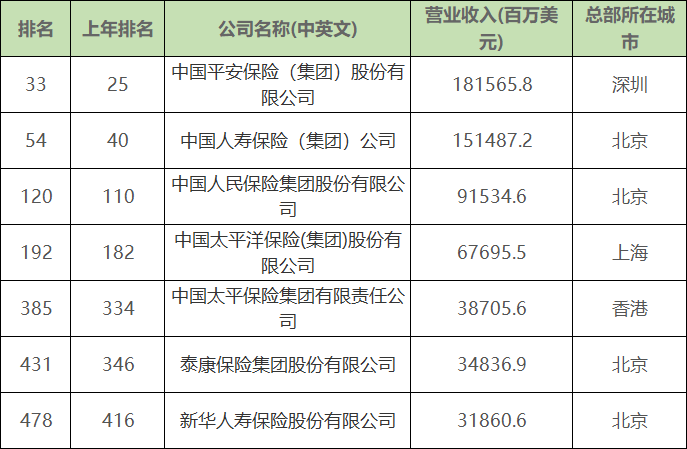 7家中国险企上榜