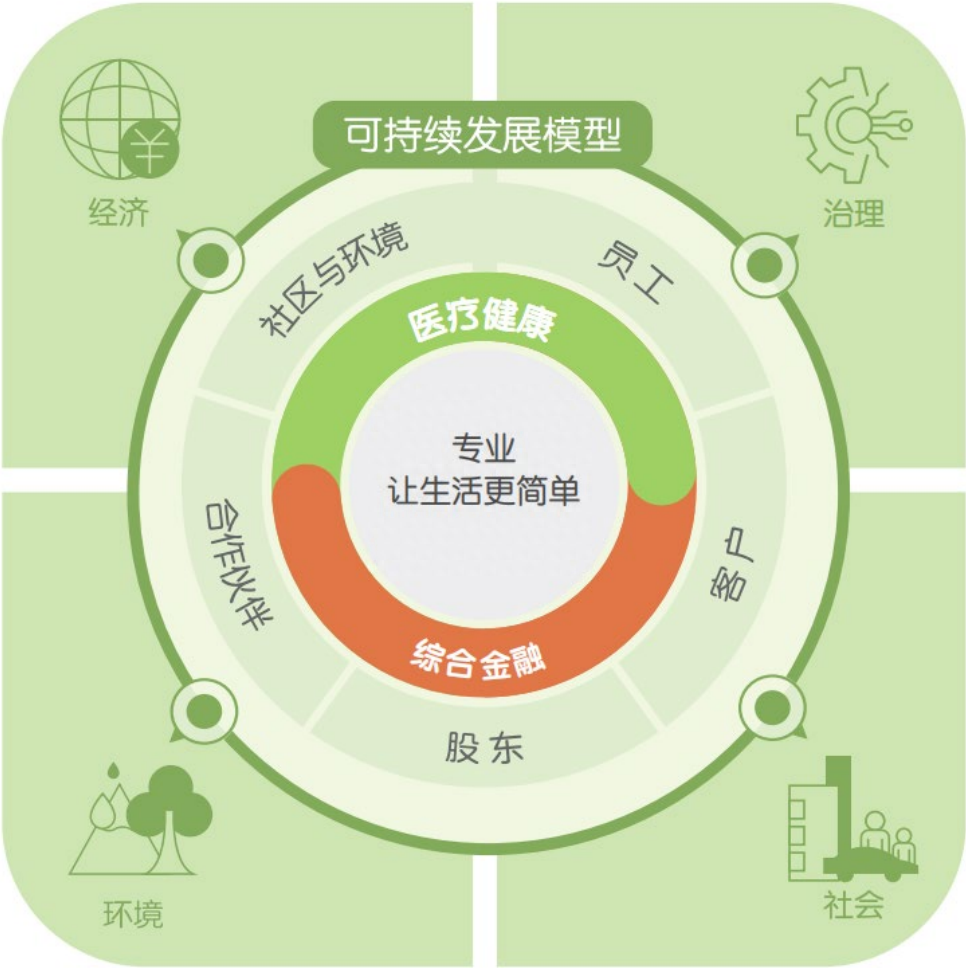 “专业创造价值”作为中国平安的核心价值观,位于可持续发展模型的核心,也是平安实现可持续发展战略的首要出发点。中国平安利用专业的商业模式持续影响社会,通过专业的金融产品和服务推动行业和社会向资源友好型和社会友好型发展,更好地赋能社会。股东、客户、员工、社区和环境、合作伙伴是中国平安重要的利益相关方。通过积极开展相与关方的互动,中国平安希望更好地回应相关方诉求,实现共享的价值创造。经济、环境、社会是中国平安依托自身可持续的商业模式创造的可持续价值和积极影响。中国平安致力于通过多元业务助力联合国可持续发展目标以及中国的现代化愿景的达成,创造人类共同的可持续价值。