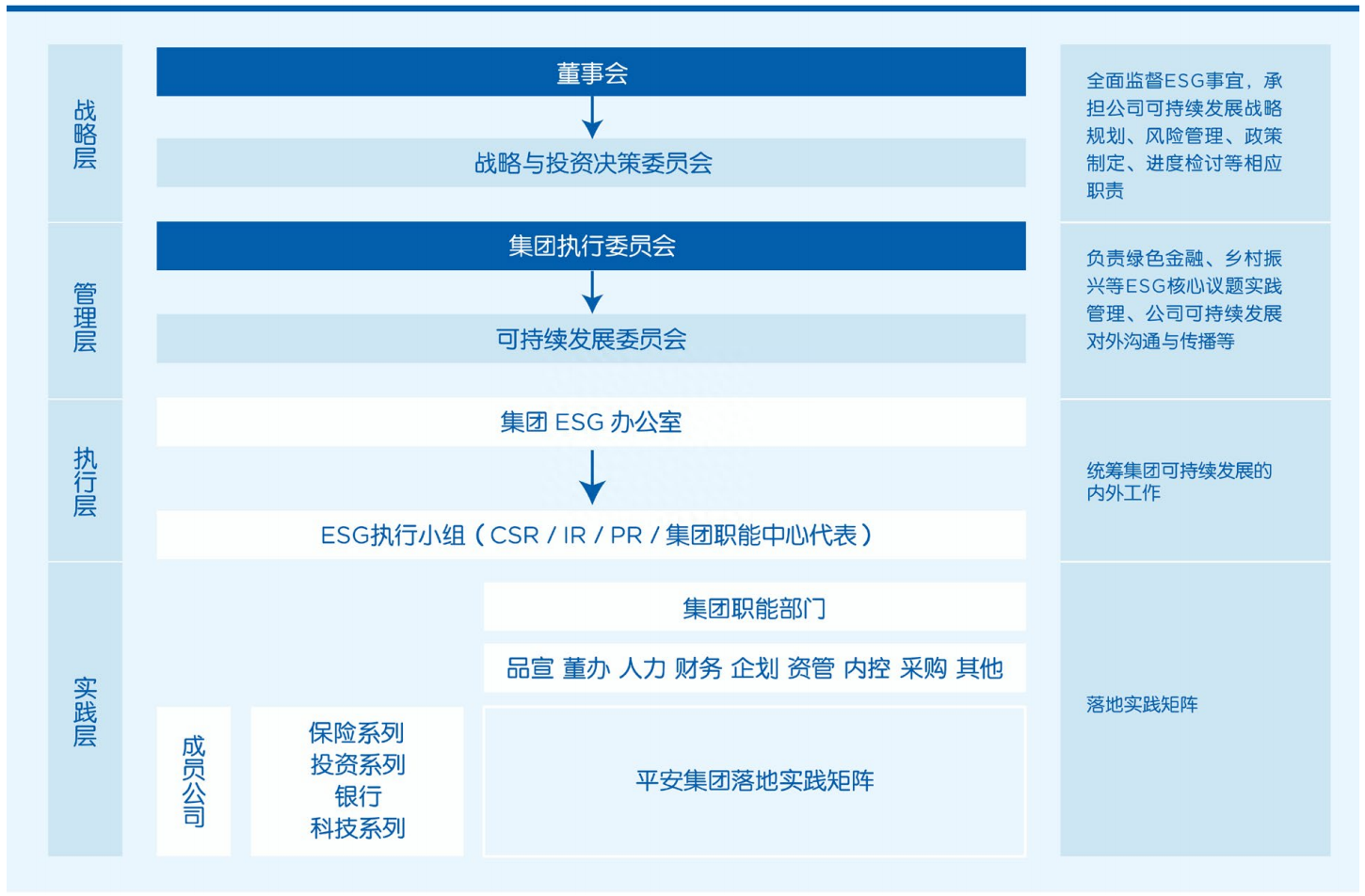 完善、稳健的企业治理是中国平安可持续发展模型的基石。随着可持续发展模型的升级,中国平安也形成了完善的ESG治理四层架构,指导集团所有职能中心和专业公司结合业务实践,更加科学、专业、体系化地加强企业治理(如下图)。
