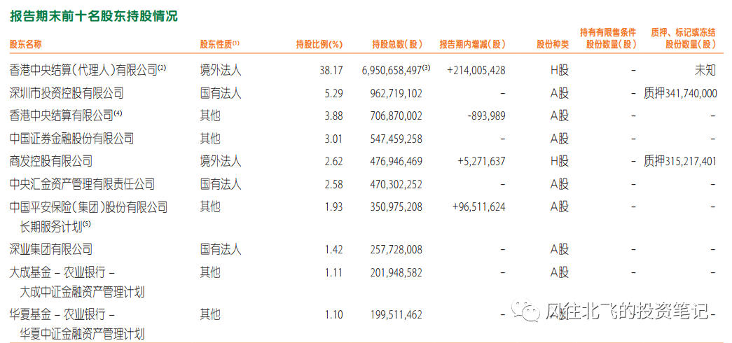 注1:香港中央结算有限公司(1)作为一个单独的股东占据了第一大股东。实际上因为内地和香港的登记结算制度不同,这里的第1大股东只是未单独在香港中央结算有限公司单独登记结算(如商发通过券商等渠道统一买入的股票的机构和散户的总和。也可以理解为去掉几个H股大股东后平安的H股总和。)