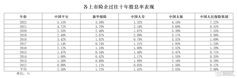 接下来对A股几家上市险企过去十年的分红情况展开分析,考虑到中国人保A股上市时间不足十年,采用的为港股市场数据。