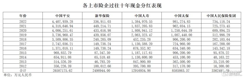 从数据上来看,可以发现,中国平安的现金分红总额明显高于其他公司,过去十年超过了2600亿元。中国人寿和中国太保的现金分红总额则分别在1000亿元上下,而新华保险和中国人民保险集团的现金分红总额则仅在300亿元左右。