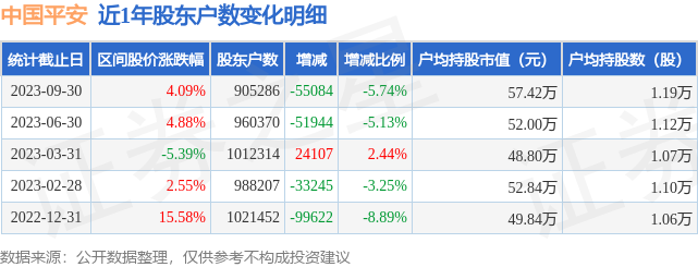 从股价来看,2023年6月30日至2023年9月30日,中国平安区间涨幅为4.09%,在此期间股东户数减少5.51万户,减幅为5.74%。