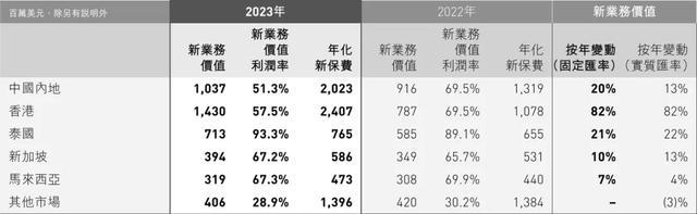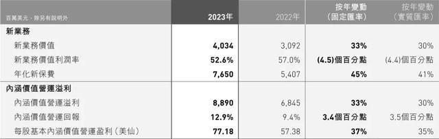 2023年新业务价值40.34亿美元,同比增长33%,新业务价值率52.6%非常高,相比2022年也有所下降,不过4.5个百分点的下降幅度,比平安要低一些。