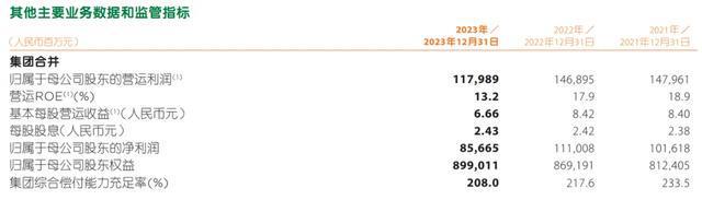 归母营运利润1179.89亿,同比下降19.68%,营运ROE13.2%,同比下降4.7个百分点,充足率208%,同比下降9.6个百分点。