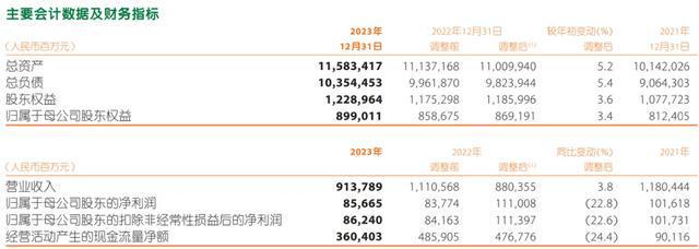 2023年营收9137.89亿,同比增长3.8%,归母净利润856.65亿,同比下降22.8%,经营现金流净额3604.03亿,同比下降24.4%。