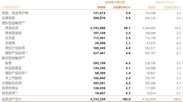 从组合类型来看,占大头的债券投资账面值2.74万亿,占比58.1%,同比上升了3.5个百分点,看样子是加大了避险力度。