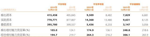 这个看一眼就行,寿险、养老险和健康险的核心能力充足率分别为105%、174.9%和248.8%,监管最低要求是50%。