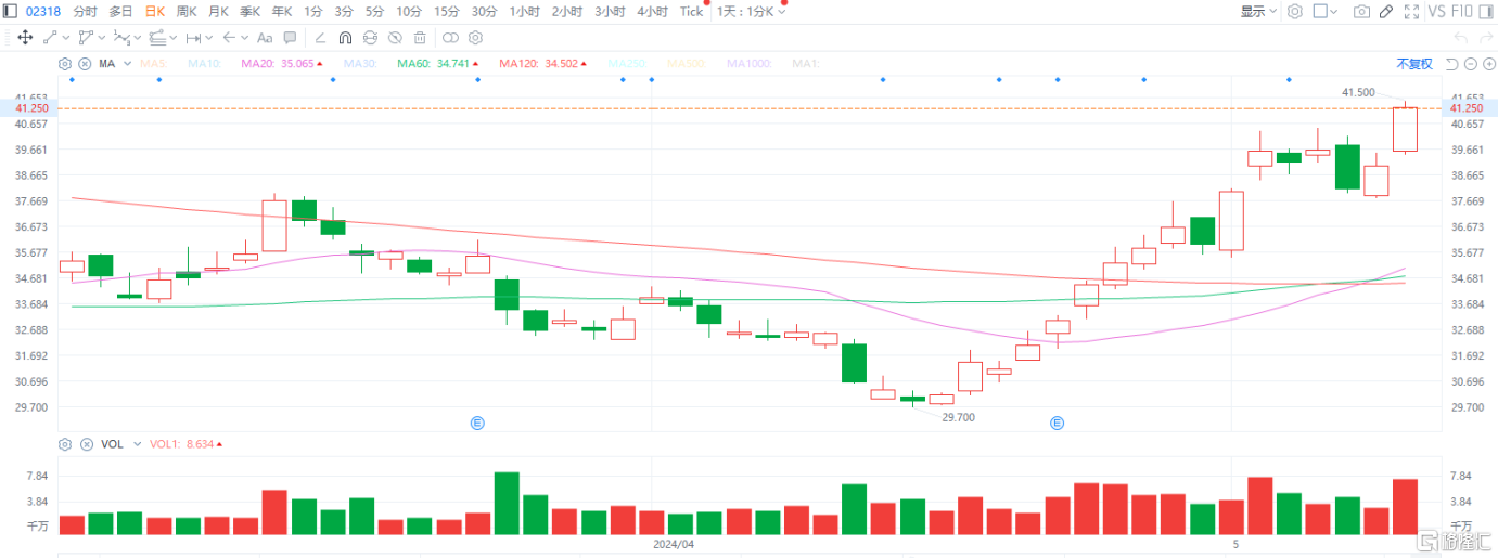 留意到自4月15日以来,不论是港股还是A股整个保险板块都呈现出明显的拐点行情,在17个交易日内更是出现满屏阳线,鲜有收跌情况发生。