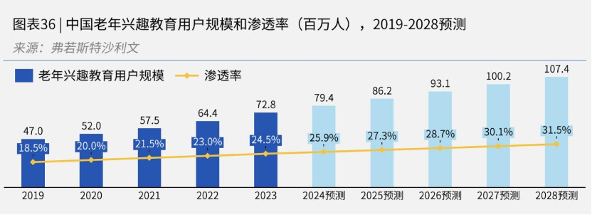 此外,有些老年人在退休后,仍没有放弃继续工作,而是过着退而不休的生活,有些老年人则是退休后投入到自己感兴趣的新的领域,在晚年体验不一样的人生。正像有些人说的,老的其实不是年龄,而是一种心态,对很多老年人来说,参与社会创造,丰富人生经历,同样有着不可替代的价值。过去几年,我国老年兴趣教育用户规模基数快速增长,2019年到2023年,从4,700万人扩大至7,280万人,增幅高达54.9%,2023年渗透率达到24.5%。预计到2027年将首次突破1亿人,2023年至2028年的年复合增长率将达到8.1%,2023年渗透率提升至 31.5%。尽管需求火爆,却难以满足实际需要。虽然不少老年人依然渴望提升自我,但受老年大学数量不足的限制,导致“一座难求”,很多人只能望学兴叹。