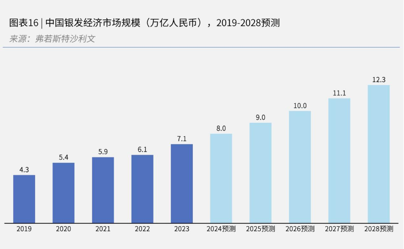 随着我国人口老龄化程度不断加深,老年人的服务消费方面发生了深刻的变化,多层次、多样化、个性化养老服务成为更多老年人安享晚年的需求,也带来了养老产业的消费升级,银发经济的快速发展。2023年,我国银发经济市场规模已达到7.1万亿人民币,预计到2028年,市场规模将达到12.3万亿人民币,复合年增长率约为11.8%。