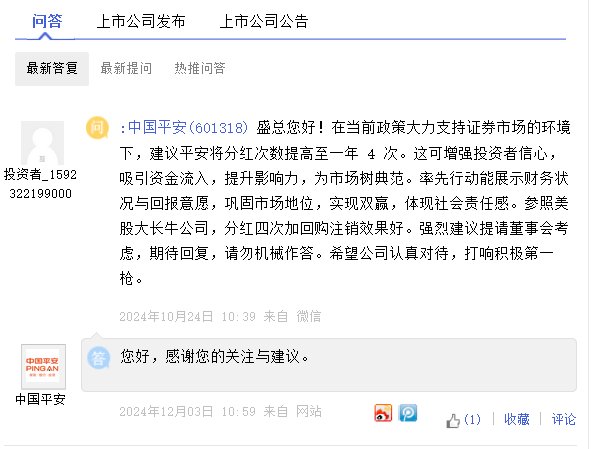 12月10日金融一线消息,日前有投资者在上证e互动平台对中国平安就分红问题提出建议。该投资者提问表示:“在当前政策大力支持证券市场的环境下,建议平安将分红次数提高至一年4次。这可增强投资者信心,吸引资金流入,提升影响力,为市场树典范。率先行动能展示财务状况与回报意愿,巩固市场地位,实现双赢,体现社会责任感。参照美股大长牛公司,分红四次加回购注销效果好。强烈建议提请董事会考虑,期待回复,请勿机械作答。希望公司认真对待,打响积极第一枪。”