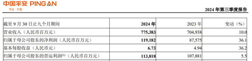 10月21日,中国平安公布了2024年三季度业绩报告。报告显示,截至2024年9月末,集团实现归属于母公司股东的营运利润 1138.18 亿元,同比增长5.5%;归属于母公司股东的净利润 1191.82 亿元,同比增长 36.1%;营业收入7753.83 亿元,同比增长10.0%;年化营运ROE15.9%。其中,寿险及健康险、财产保险以及银行三大核心业务实现增长,三项业务合计归属于母公司股东的营运利润1196.51亿元,同比增长5.7%。
