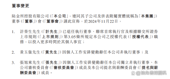 按照这个条件检索公开信息,2024年11月22日,陆金所发布公告,计葵生退任公司执行董事、联席首席执行官和公司授权代表。黄玉强和张旭东辞任公司非执行董事。