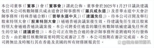 1月27日收盘后,陆金所在港交所发布了《建议更换核数师可能延迟刊发2024年年度业绩》的公告,正式宣告与审计方普华永道“分手”,第二天,陆金所又发了一个短暂停牌公告。