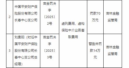 2月18日,吉林金融监管局下发吉金罚决字〔2025〕2 号与3号文件,剑指中国平安财产保险股份有限公司长春中心支公司及其时任总经理刘贵阳的违规行为。