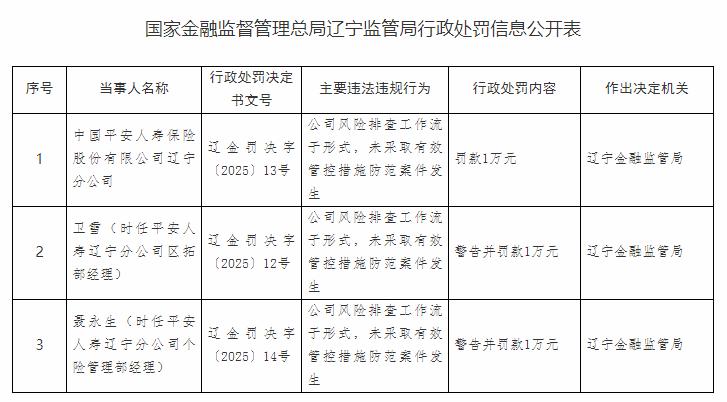 同日,辽宁金融监管局公布的辽金罚决字〔2025〕12 号至14号文件显示,中国平安人寿保险股份有限公司辽宁分公司风险排查工作流于形式,未能有效管控风险防范案件发生,辽宁金融监管局对该司处以1万元罚款;时任平安人寿辽宁分公司区拓部经理卫雪及平安人寿辽宁分公司个险管理部经理聂永生两名责任人因未切实履行岗位职责,同样受到警告并罚款 1 万元的处罚。
