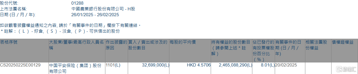 格隆汇2月26日丨根据联交所最新权益披露资料显示,2025年2月20日,农业银行(01288.HK)获中国平安保险(集团)股份有限公司在场内以每股均价4.5706港元增持3269.9万股,涉资约1.49亿港元。