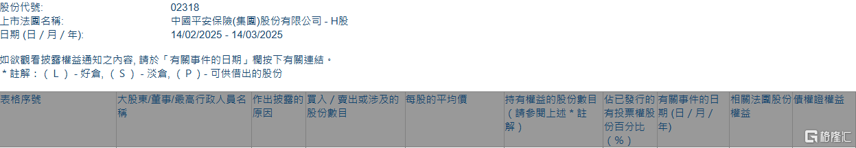 根据联交所最新权益披露资料显示,2025年3月6日,中国平安(02318.HK)获UBS Group AG在场内以每股均价48.2151港元增持好仓1830.79万股,涉资约8.83亿港元。