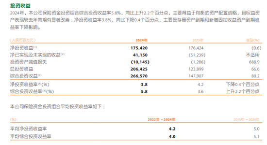 净投资收益为1754.2亿,同比减少0.6%,总投资收益为2064.25亿,同比大增66.6%。净投资收益率3.8%,综合投资收益率5.8%。