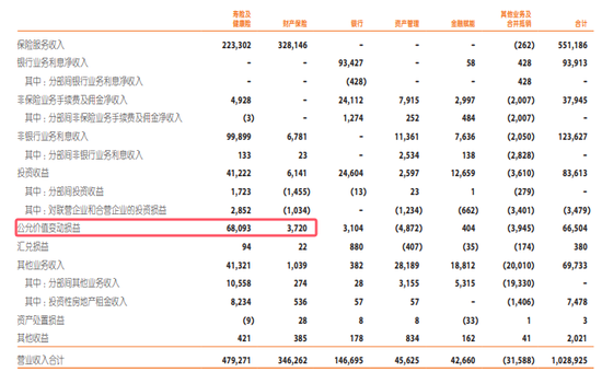 “净已实现及未实现的收益”主要由证券投资差价收入及公允价值变动损益组成。年报显示,寿险及健康险的公允价值变动损益为680.93亿,财险业务公允价值变动损益37.2亿,两项合计为718.13亿。