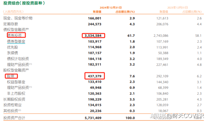 “哑铃型”投资的另一端,则包括股票、权益型基金、理财产品投资、非上市股权。其中,虽然股票投资占比仅为7.6%,但绝对额却高达4373亿元,这一数额比2023年上涨了1452亿元。