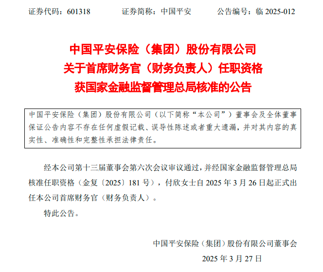 上周五,中国平安保险(集团)股份有限公司对外发布了《关于首席财务官(财务负责人)任职资格获国家金融监督管理总局核准的公告》。