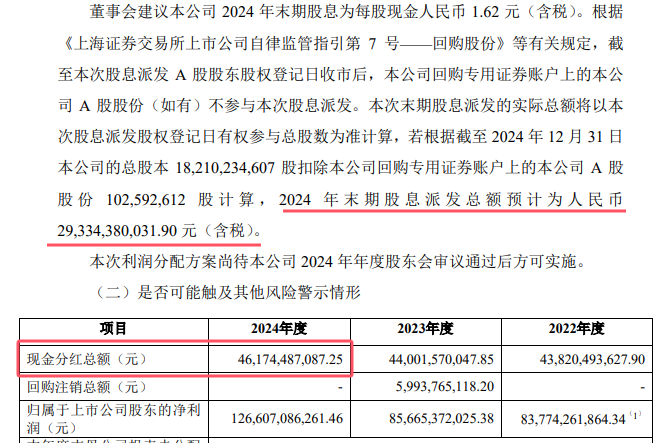 3月份,中国平安刚发布了2024年度利润分配方案,每股派发现金红利1.62元,累计分红293.34亿。加上2024年中的168.4亿分红(已经实施),2024年中国平安累计给股东分红461.74亿。