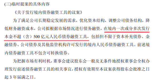 融资方式为在境内一次或分多次发行本金不超(含)500亿元人民币债券融资工具,包括但不限于资本补充债券、金融债券、公司债券及其他监管机构许可发行的境内人民币债券融资工具。