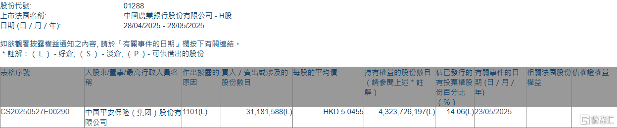 根据联交所最新权益披露资料显示,2025年5月23日,农业银行(01288.HK)获中国平安保险(集团)股份有限公司在场内以每股均价5.0455港元增持3118.16万股,涉资约1.57亿港元。