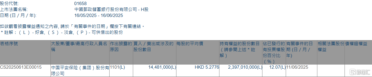根据联交所最新权益披露资料显示,2025年6月11日,邮储银行(01658.HK)获中国平安保险(集团)股份有限公司在场内以每股均价5.2776港元增持1448.1万股,涉资约7642.5万港元。