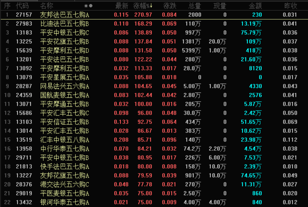 今天又见证了认购证的奇迹。中国平安在香港市场的认购证全线暴涨。平安中银五七购C大涨138%,平安花旗、平安法巴、平安摩利、平安摩通都一度实现了单日翻倍。