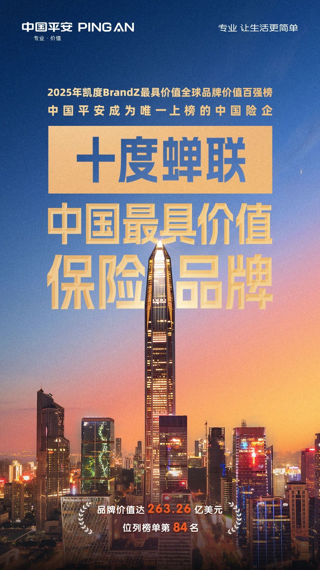 5月15日,2025年凯度BrandZ“最具价值全球品牌价值百强榜”发布,中国平安以超263亿美元的品牌价值跃升至全球保险业品牌价值第一位,品牌价值同比增长25%,位列全球品牌价值百强榜第84位,较去年上升6位。