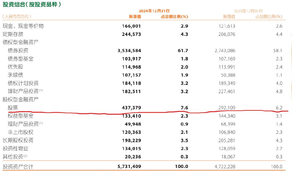 2024年公司股票投资达4373.8亿元,比2023年大幅增长约50%,其占投资组合的比重为7.6%,也比2023年明显提升1.4个百分点。由于公司的股票配置在同业中不算高,再加上政策上放宽了险资持有股票的约束,预计未来公司仍会不断增配高股息的股权,从而夯实投资收益。