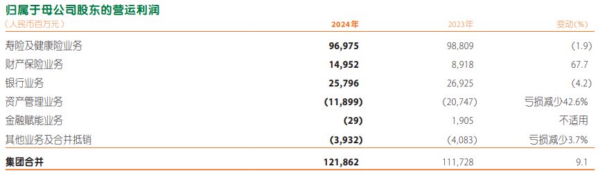 如果从负债端看,中国平安寿险近两年已经走出低谷,但公司股价相对弱于同业,其中一个主要原因是:公司报表利润受其他资管板块减值拖累(很大一部分来自地产敞口)。根据公司年报,2024年公司资产管理业务的归母营运利润为-119亿元,是拖累公司整体利润增速的关键。