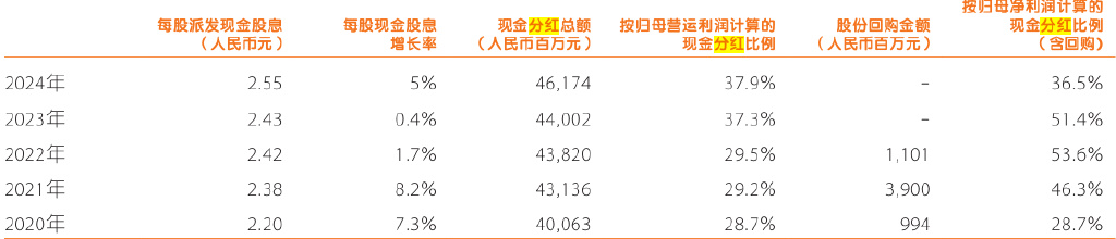 中国平安极为注重股东回报,现金分红连续13年保持增长,2024年全年累计每股派息达2.55元/股,同比增加5%。而且,公司的分红以归母营运利润作为基准,稳定性更高,2024年现金分红占归母营运利润的比例达37.9%。由于营运利润以净利润为基础,剔除短期波动性较大的损益表项目和管理层认为不属于日常营运收支的一次性重大项目及其他,平抑短期投资波动,给予投资者更为稳定的分红预期。