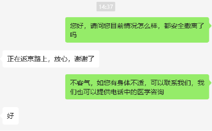 同日,平安人寿北京分公司接到一笔援助报案。正在天津旅游的57名平安客户和1名平安代理人Z先生,因连日来暴雨引发的汛情受困于蓟县下营镇。北京分公司迅速响应,协调蓟县当地救援力量,展开救援。在急难援助服务的帮助下,29日下午5时,客户和代理人全部安全返京。