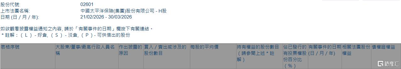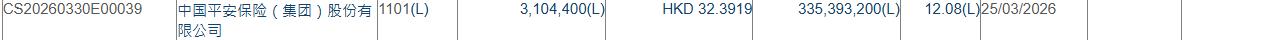 根据联交所最新权益披露资料显示,2026年3月25日,中国太保(02601.HK)获中国平安保险(集团)股份有限公司在场内以每股均价32.3919港元增持310.44万股,涉资约1.01亿港元。