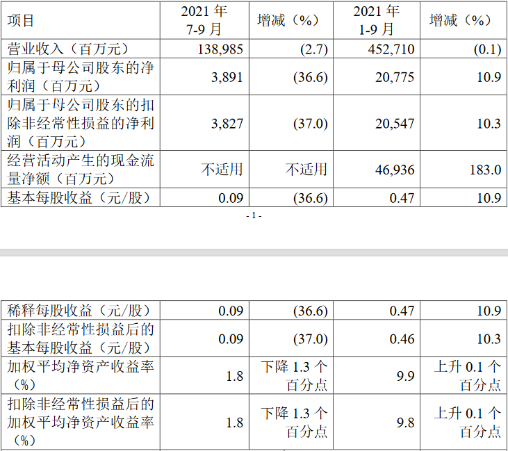 中国人保表示,2021年7-9月,归属于母公司股东的净利润同比下降36.6%,主要原因为赔付支出、提取准备金同比增长等。