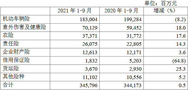 今年前三季度,人保财险实现原保险保费收入3457.96亿元,同比增长0.5%;赔付率73.8%,同比提高8.6个百分点;费用率25.1%,同比下降8.1个百分点;综合成本率98.9%,同比提高0.5个百分点;净利润199.92亿元,同比增长15.3%。其中,车险和信用保证险原保险保费收入同比下降,降幅分别为8.2%和64.8%。