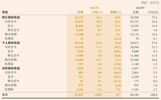 按渠道看,2021年,人保寿险银行保险渠道、个人保险渠道、团体保险渠道分别实现保费收入427.25亿元、501.94亿元、39.28亿元,同比分别增长18.9%、降低8.4%和降低27.8%。