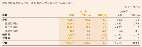 按险种来看,2021年度,因行业重疾险相关规则改变,新重疾产品市场接受度有待进一步提升,人保寿险实现健康险原保险保费收入179.59亿元,同比下降14.8%。