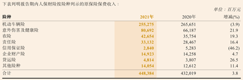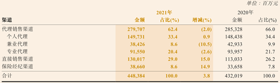 分渠道来看,2021年,人保财险直接销售渠道原保险保费收入同比增长15.0%;代理销售渠道原保险保费收入同比下降2.0%。