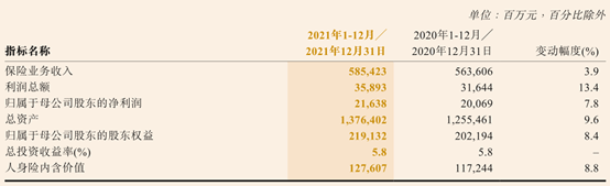 数据显示,2021年,中国人保实现营业收入5976.91亿元,同比增长2.4%;保险业务收入5854.23万元,同比增长3.9%;实现归属于母公司股东净利润216.38亿元,同比增长7.8%。