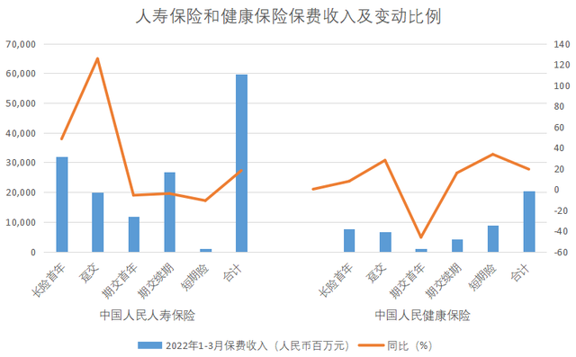 在财险不断发力的同时,另外两家子公司人寿保险和健康保险同样表现不俗。从实现的保费收入来看,这两家公司2022年一季度长期保险首年保费收入较上年同期均有所提高。其中人寿保险长险首年收入为319.15亿元,健康保险长险首年收入为75.76 亿元。拆分来看,两家公司长险保费的趸交收入均较上年有较大增幅,分别增长125.4%和27.8%,而期交首年实现的保费为负增长,保费收入同比下降5.8%和46.2%。