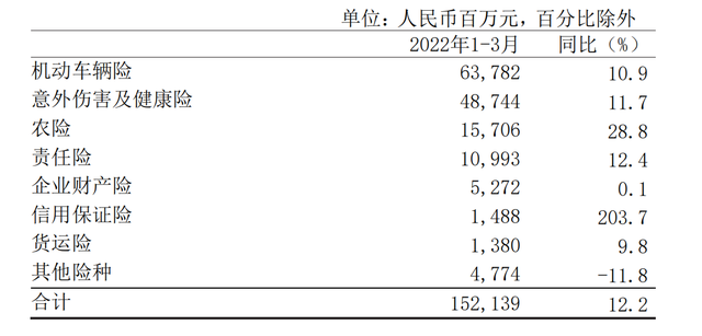 从三家子公司的保费收入金额来看,中国人民财产保险股份有限公司保费收入最高。明细显示,机动车辆险贡献了637.82亿元,同比增长10.9%,位居财险保额榜首,同时为中国人保贡献了20%的保费收入;意外伤害及健康险紧随其后,第一季度实现487.44亿元保费收入,同比增长11.7%。