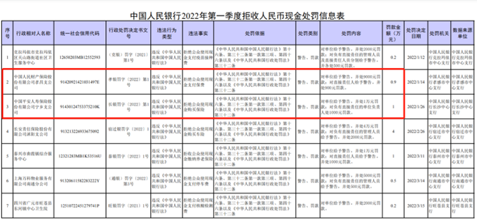 从处罚信息表中可以看出,7家被罚单位中,中国人保和中国平安赫然在列。其中,中国人保因“拒绝公众使用现金支付支付保费”被罚0.9万元,中国平安因“拒绝公众使用现金购买保险”被罚1万元。