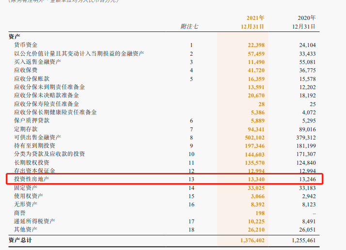 另悉,截止2021年12月31日,中国人保资产总计13764.02亿元,同比增长9.63%。其中,货币资金为223.98亿元,同比减少7.08%,应收保费417.2亿元,同比增长13.45%,投资性房地产为133.4亿元,同比增长0.71%。