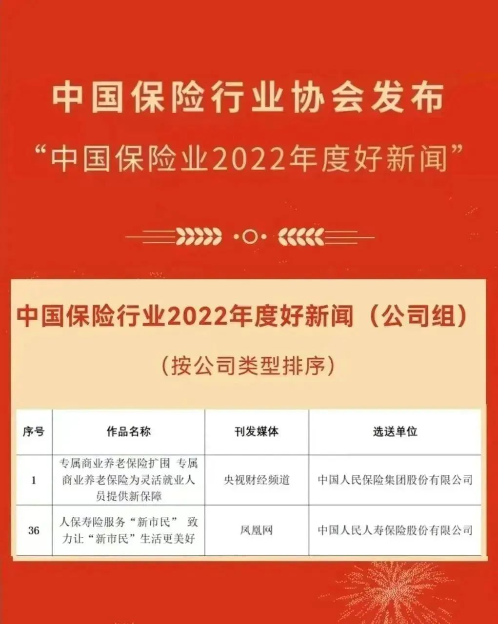 2023年1月18日,在中国保险行业协会关于“中国保险业2022年度好新闻”征集发布情况的通报中,中国人保凭借《专属商业养老保险扩围专属商业养老保险为灵活就业人员提供新保障》《人保寿险服务“新市民”致力让“新市民”生活更美好》,荣获两席“中国保险业2022年度好新闻(公司组)”奖项。